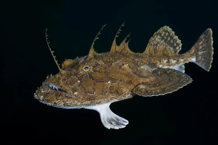 This ambush predator buries itself in the seabed, exposing only its “fishing rod” to hypnotize prey with the twitching lure at its tip. Once the curious victim approaches, the monkfish lunges forward, pushing off with its powerful front fins.