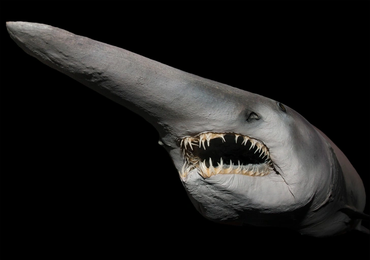 Through the semi-transparent skin of the goblin shark, blood vessels are visible, giving it an unusual pinkish hue. Even more striking are its jaws: they can shoot forward almost to the tip of the shark’s long, sensitive snout, then snap shut, pulling in water — and anything caught within it.