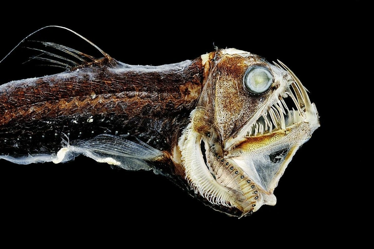 These fish are relatively small, rarely exceeding a few dozen centimeters in length, but their teeth are enormous. Their long, razor-sharp front fangs allow them to deal devastating slicing blows, even to large prey. Because the teeth are fixed in place, viperfish must open their jaws nearly 90 degrees to swallow sizable victims.